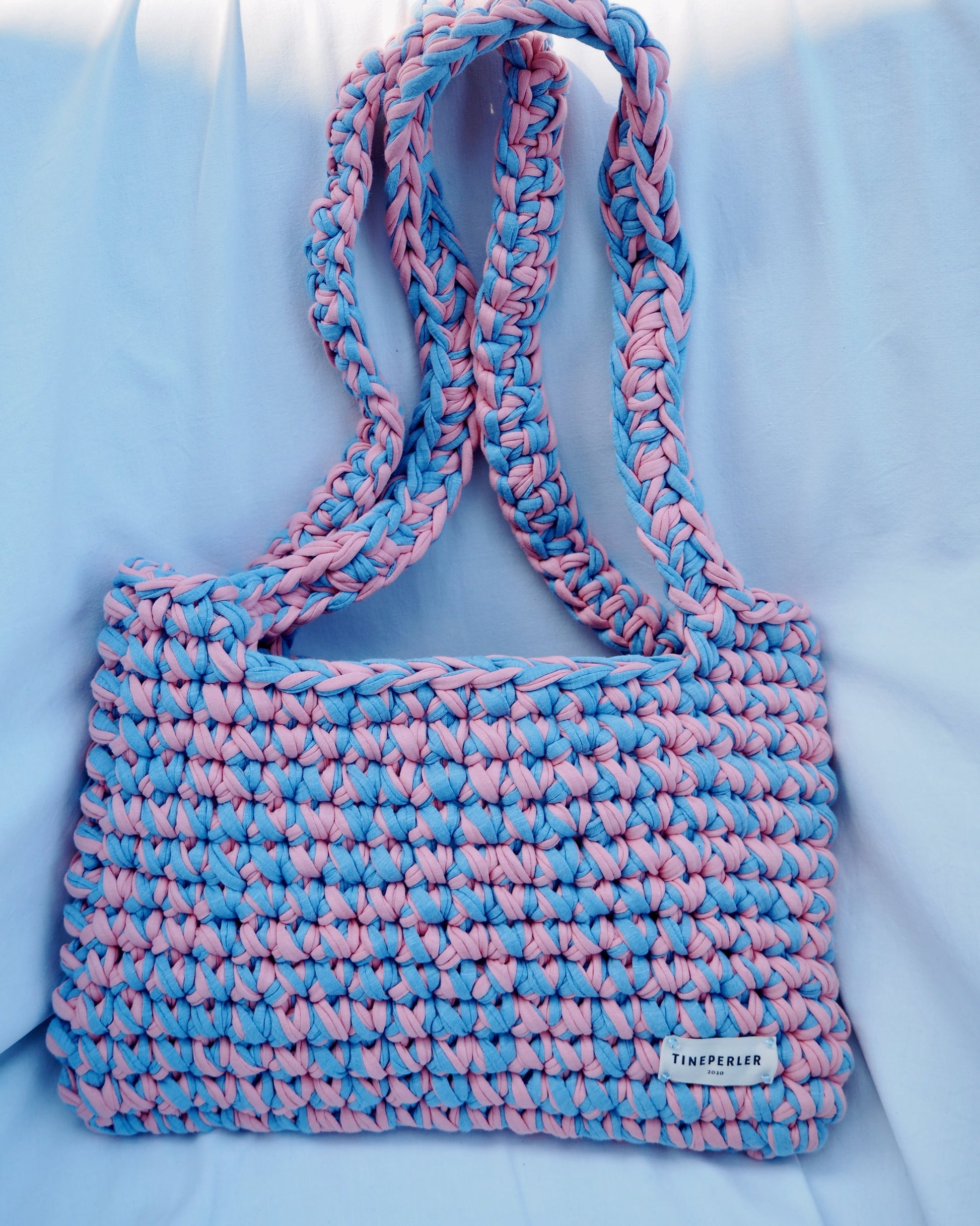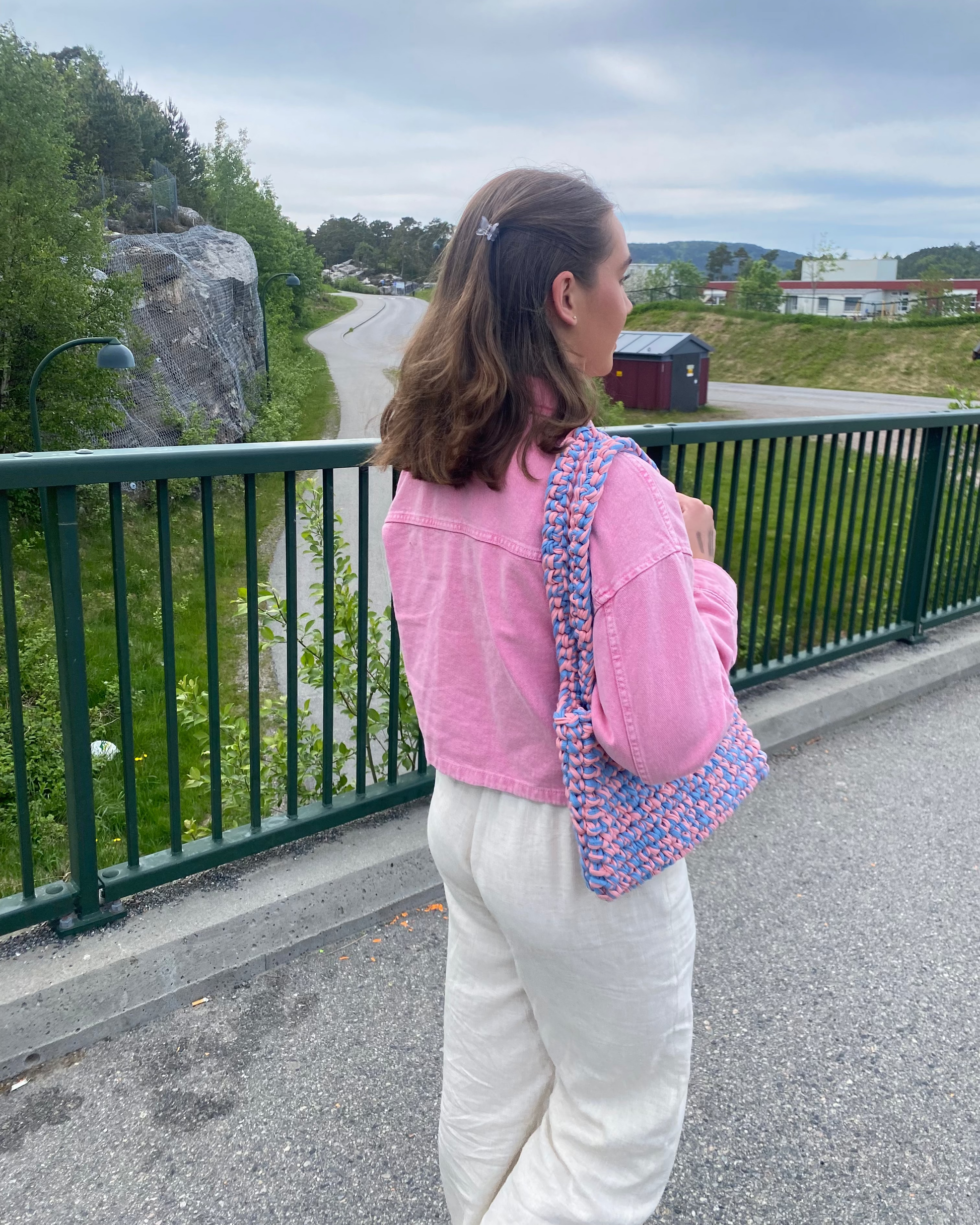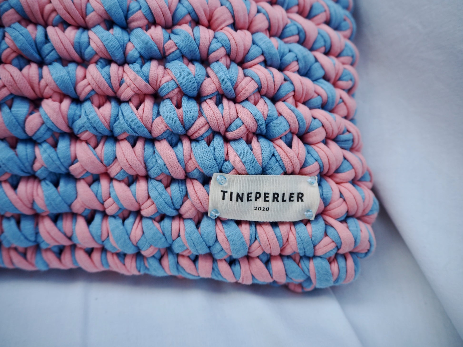 Materialet til veskene jeg lager er av resirkulerte tekstiler fra moteindustrien. De er laget med nøye arbeid og mye baktanke. Veskene hekles og merkene sys på for hånd.