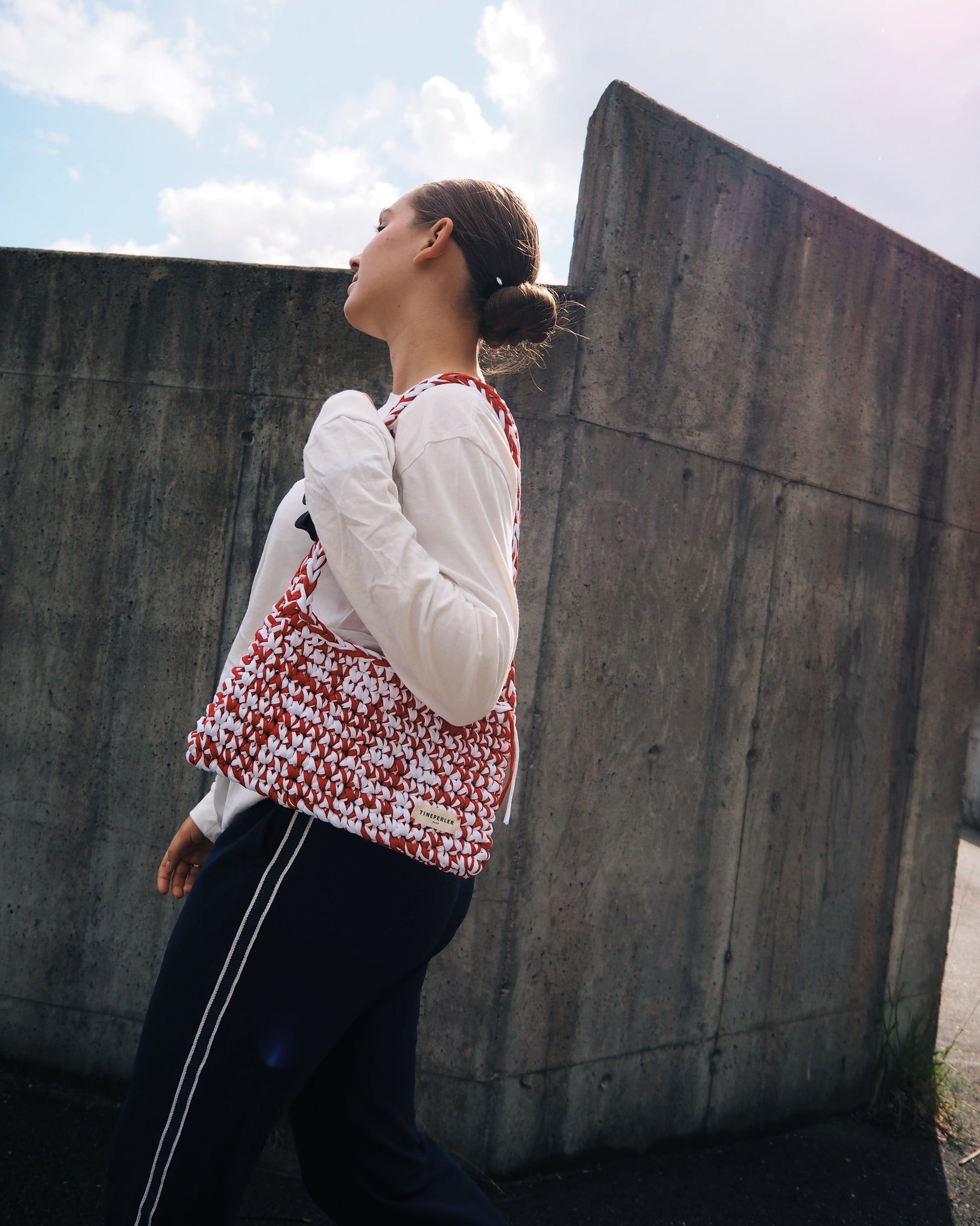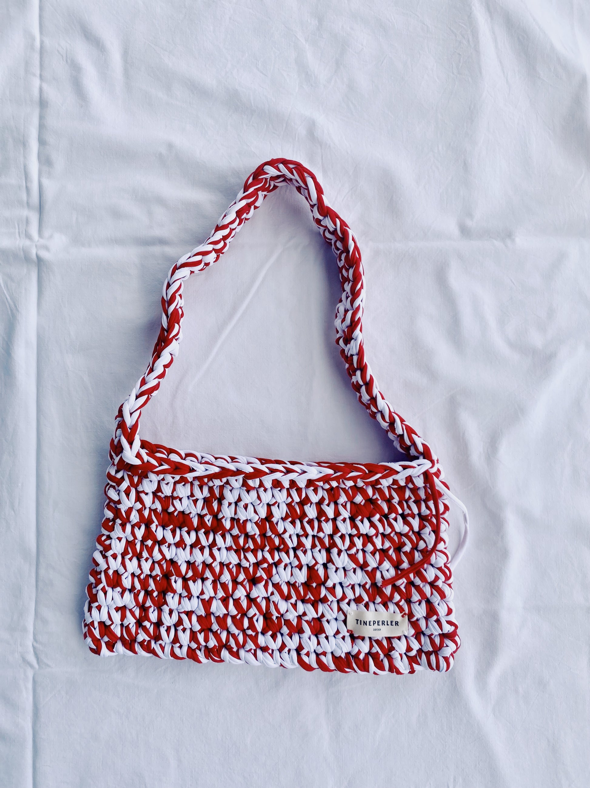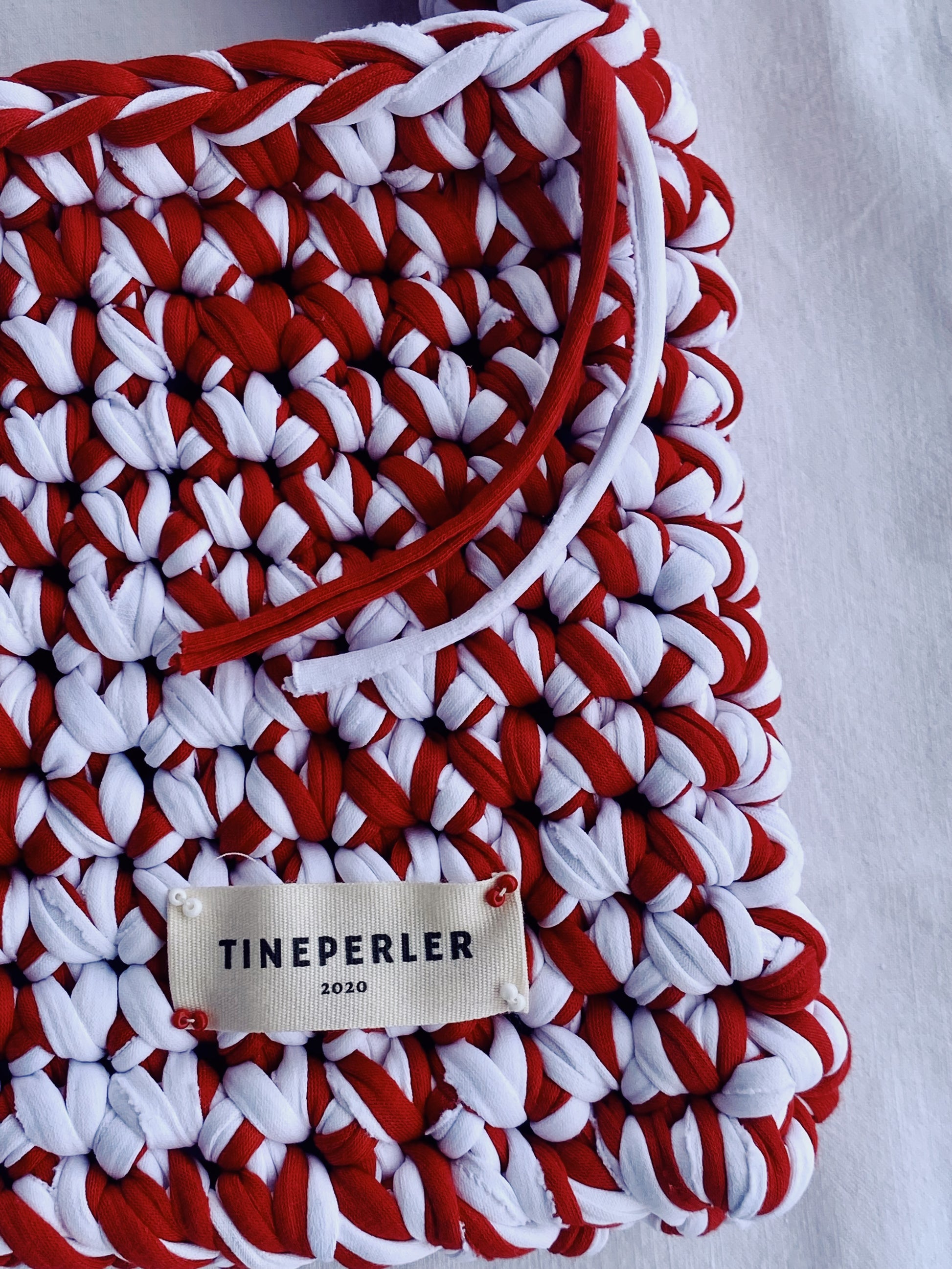 Materialet til veskene jeg lager er av resirkulerte tekstiler fra moteindustrien. De er laget med nøye arbeid og mye baktanke. Veskene hekles og merkene sys på for hånd.