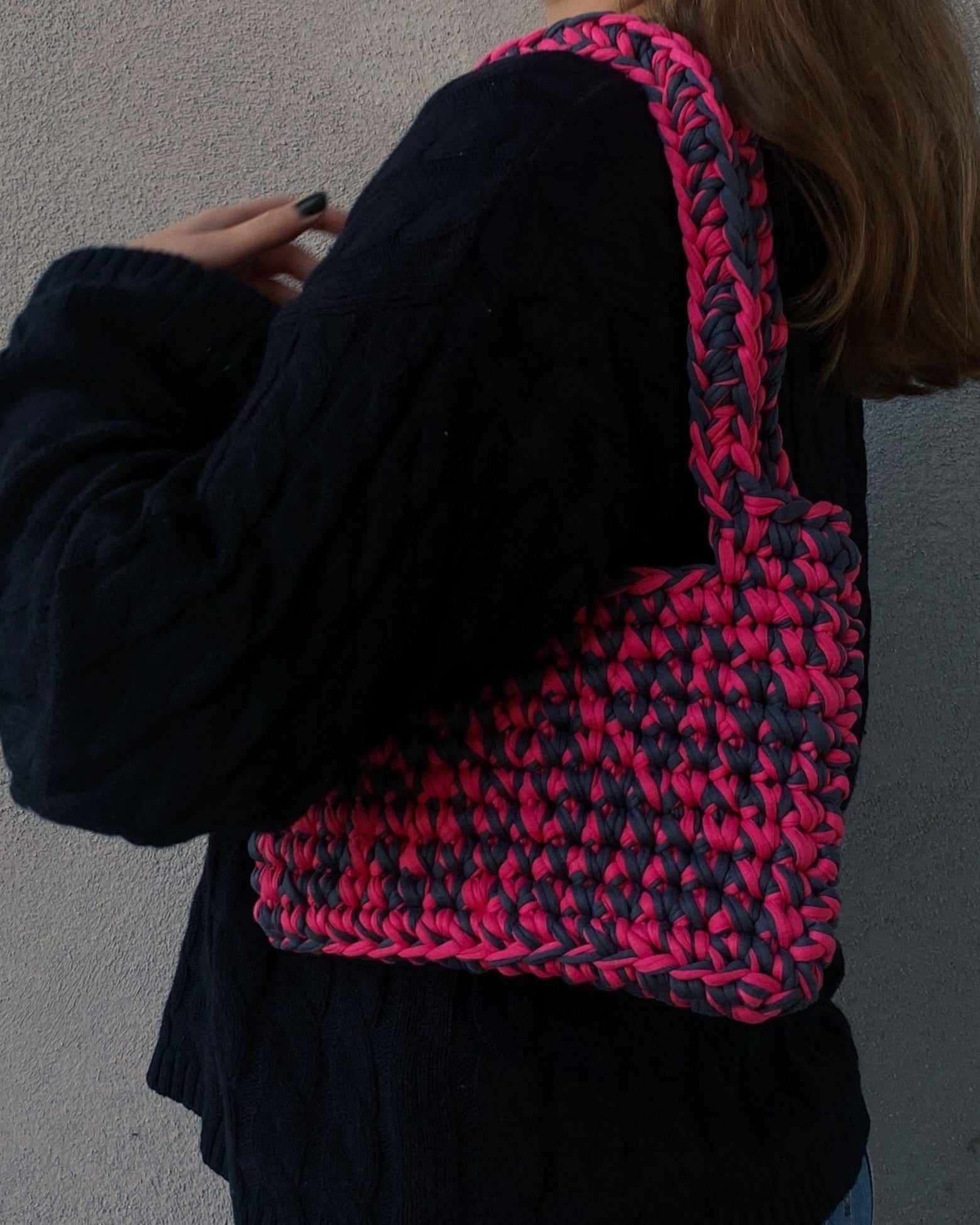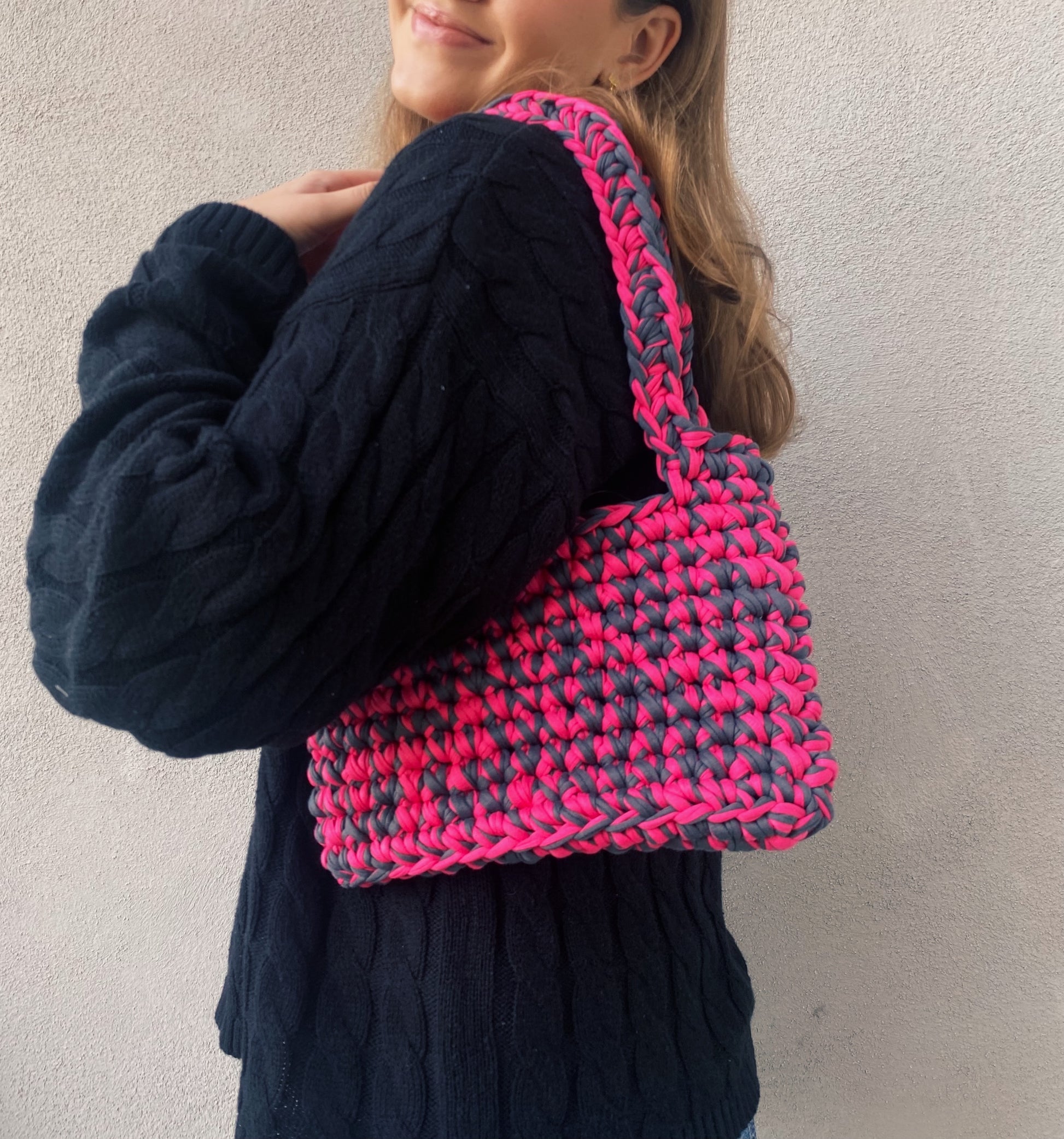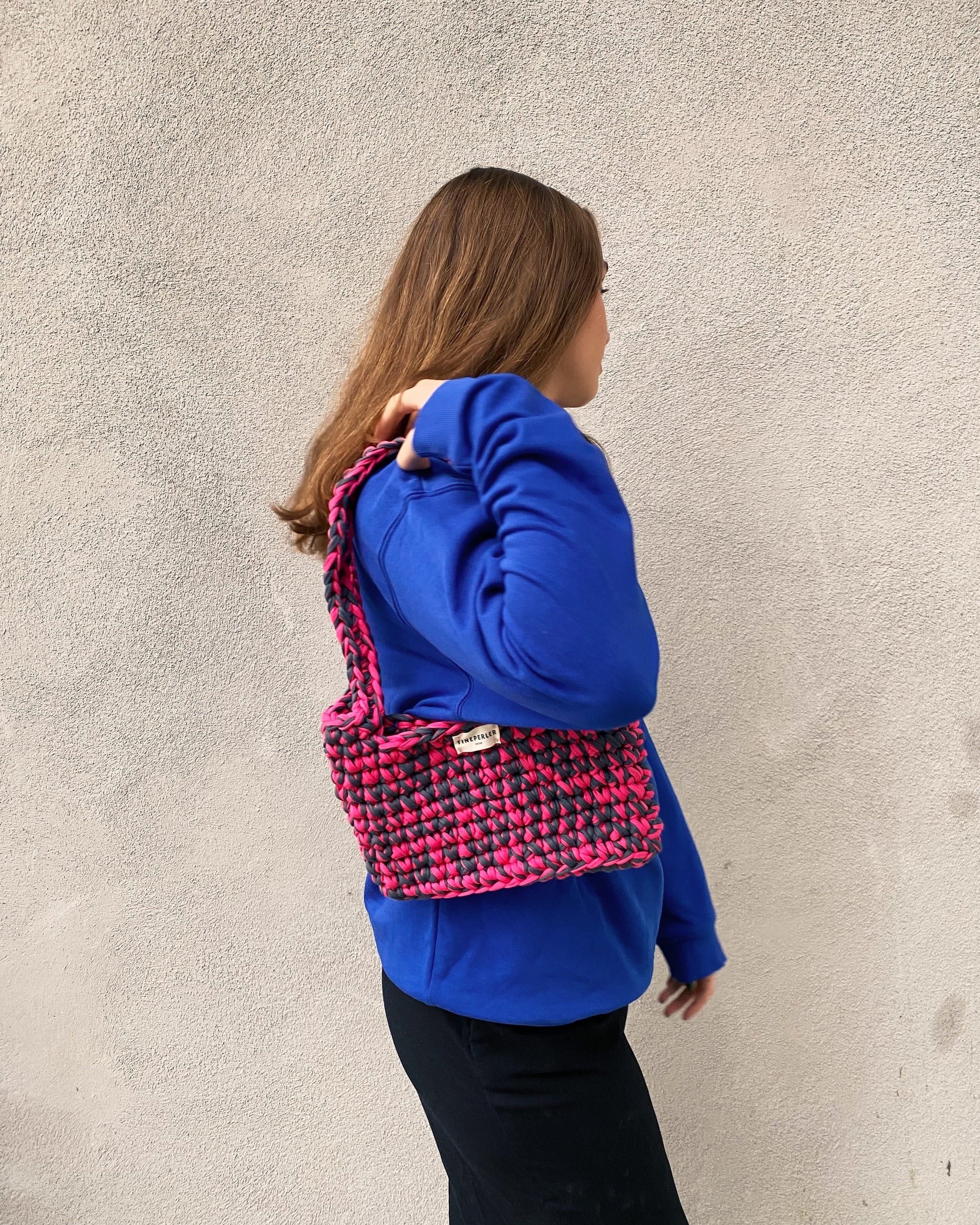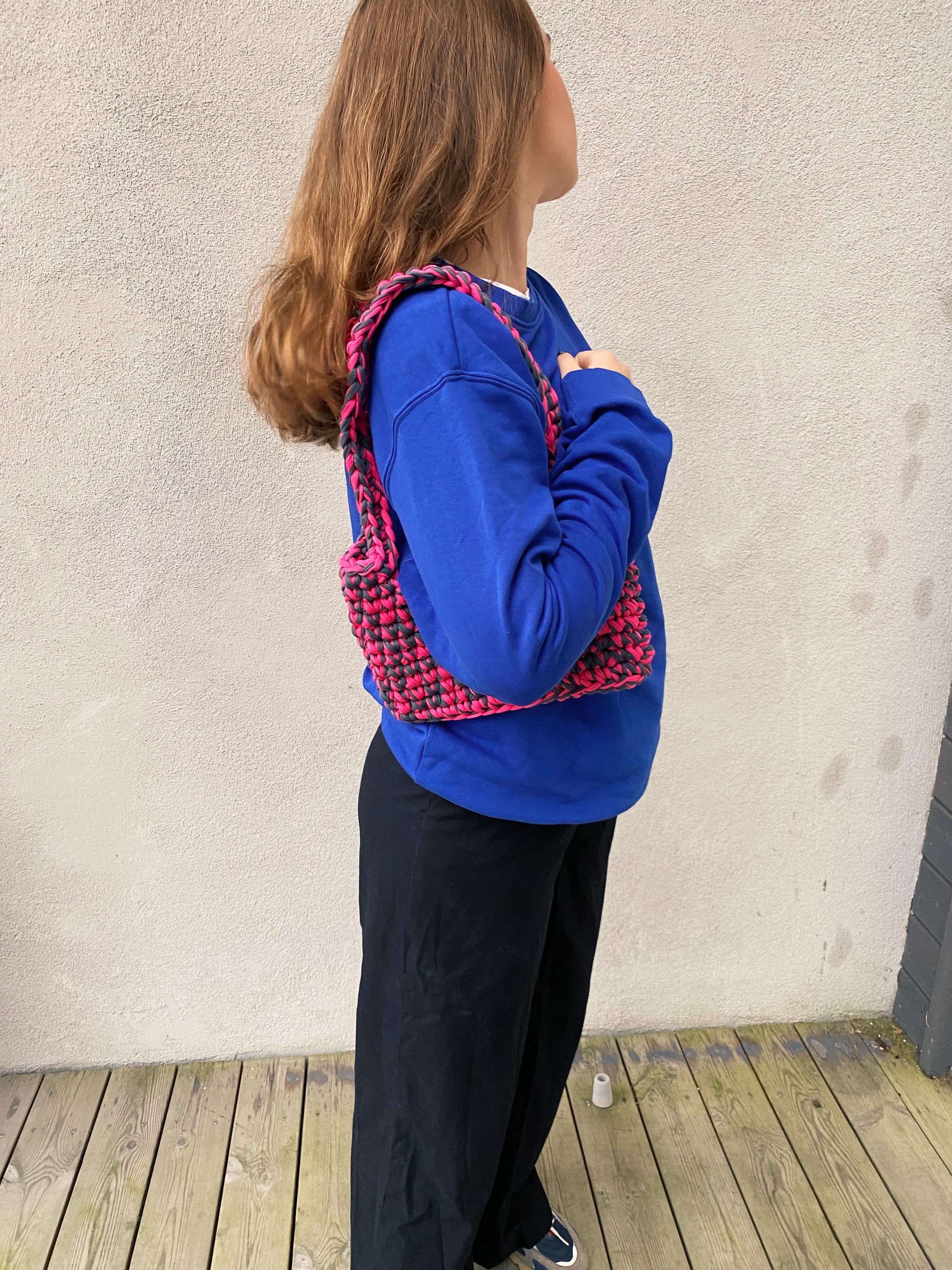 Materialet til veskene jeg lager er av resirkulerte tekstiler fra moteindustrien. De er laget med nøye arbeid og mye baktanke. Veskene hekles og merkene sys på for hånd.